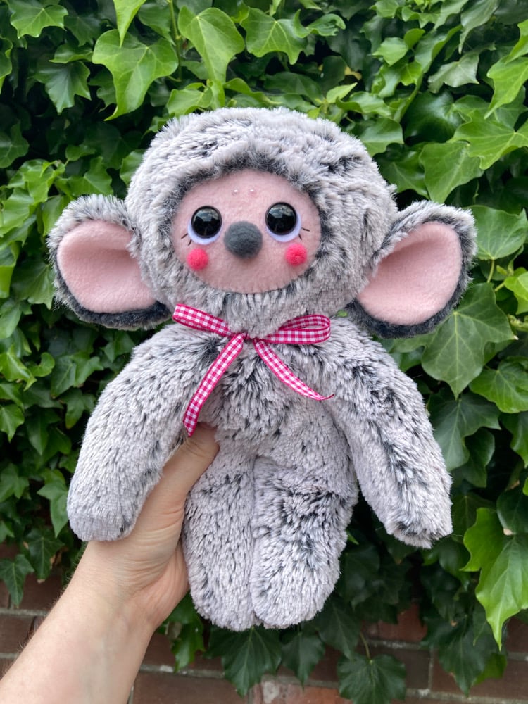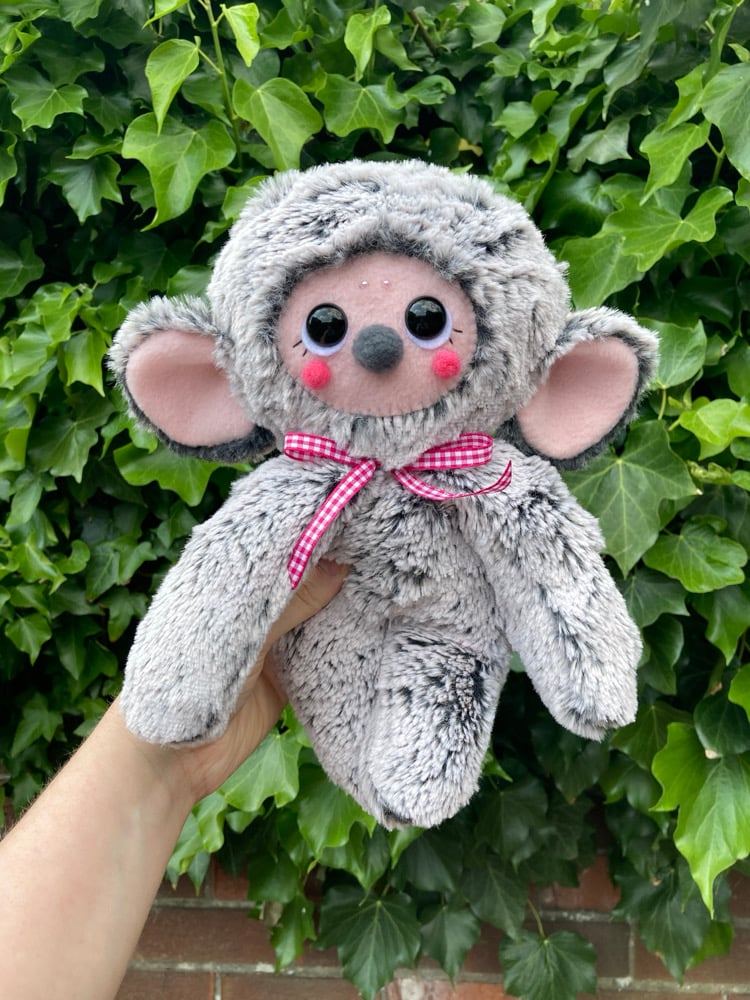 Millie the Mousey Sprite is a handmade stuffed art doll made from an unwanted faux fur scarf. She is stuffed with polyester filling and weighted with poly pellets in her bum.