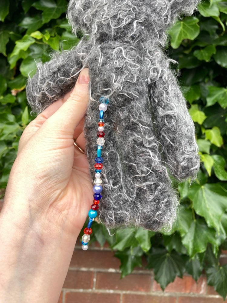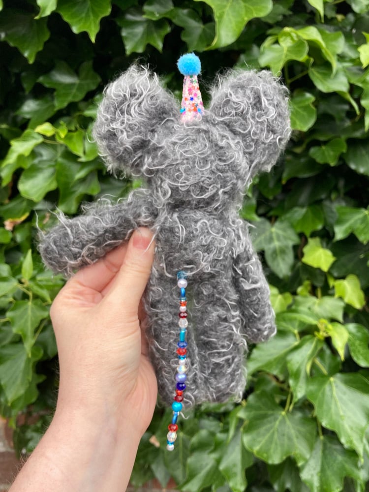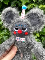 Stefan the Mouse Clown is a handmade stuffed art doll made from faux fur and felt with a beaded tail. He is stuffed with polyester filling and weighted with poly pellets in his tummy.